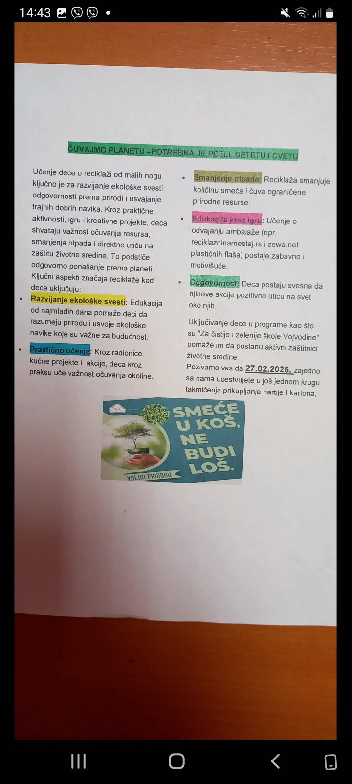 02.02.2026. – Поред месечних зидних новина, паноа и еко-кутка, путем флајера и различитих еколошких текстова које делимо у Viber групи трудимо се да додатно активирамо и мотивишемо децу, родитеље и ширу заједницу да се укључе у очување животне средине.
